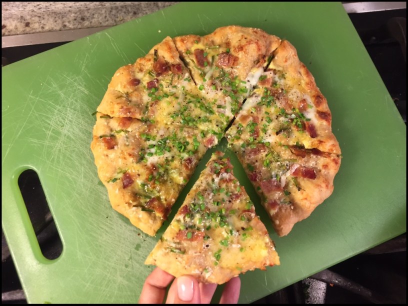 Just as with latkes and fritters, a binding agent is needed for the hash browns to hold its shape, which in this case is the shape of pizza dough. One medium egg is scrambled and tossed with the potatoes, plus some chopped yellow onions and chives for some pizzazz.