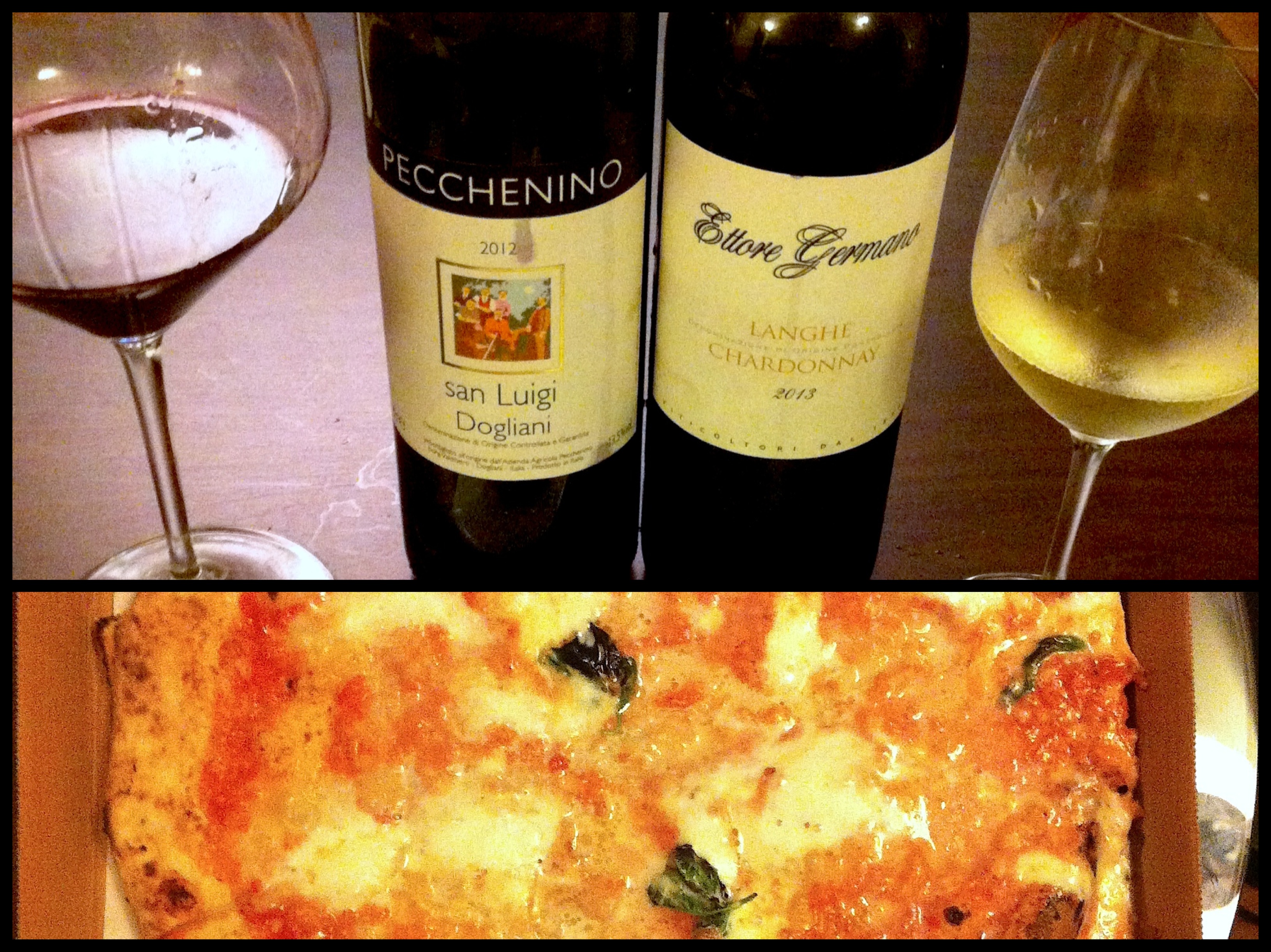 For a double-punch pairing, two styles of Piedmonte wine sat waiting: a chardonnay from a classic Barolo producer (Ettore Germano, Langhe DOC, 2013, $21) scooped up from Village Vino and a lightly-chilled dolcetto (Pecchenino san Luigi, Dogliani DOCG, 2012, $13) from San Diego Wine Company. The chardonnay offered slight butteriness with a refreshing background of tart lemon and apple. The creamy bufala mozzarella amplified an already richly present wet stone quality. The dolcetto, despite the name (in Italian, “little sweet one”), was dry but deeply aromatic with tart fruit aromas of blackberry, plum and black cherry mixed up with a dry soil component. The plush tannins were emphasized in the presence of pizza, but the heat, ranking 13.5% abv, overwhelmed the quieter toppings. Although the two weren’t completely incompatible, they certainly didn’t make for a memorable pairing. While the chardonnay matched up well, a lighter style of dolcetto may be more suitable, such as with a DOC like d’Alba or d’Asti, where the minimum alcohol requirement is a half percent lower at 11.5%. Taken in a different direction, the charred underbelly of Neapolitan-style crust seems to want for a bolder, zestier wine to match the smokiness, such as a medium-bodied zinfandel (primitivo, even) or Northern Rhone syrah. And thus the adventure continues.