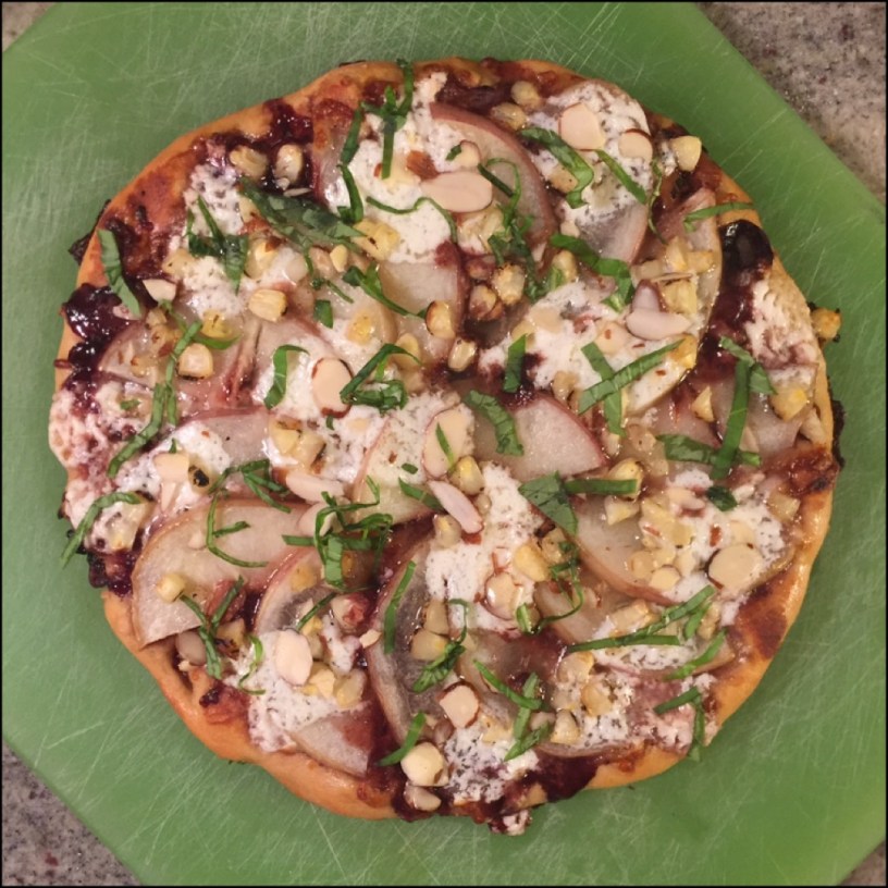 Plucking from another jerk pizza recipe, I mixed the pineapple juice into tomato paste with red wine vinegar until a sauce like consistency was achieved.
